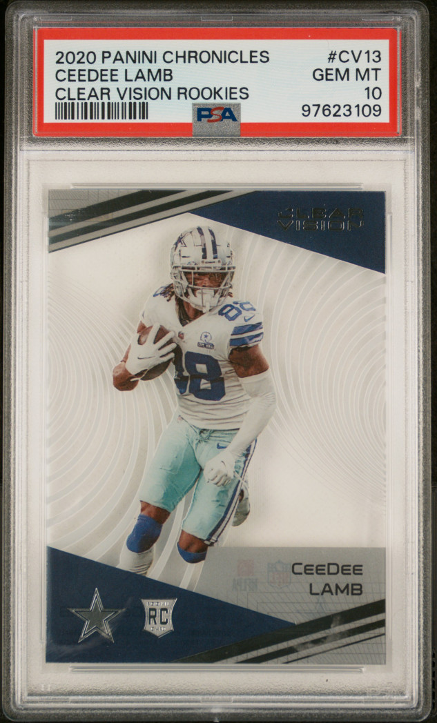 The product is a 2020 Panini Chronicles Clear Vision Rookies trading card featuring football player CeeDee Lamb. This card is part of the Clear variety set and has been professionally graded as a rookie card. It bears certification number 97623109 and comes from the renowned manufacturer Panini. The card is a valuable addition for collectors and fans of sports trading cards, especially those interested in rookie cards and football memorabilia from the 2020 season.