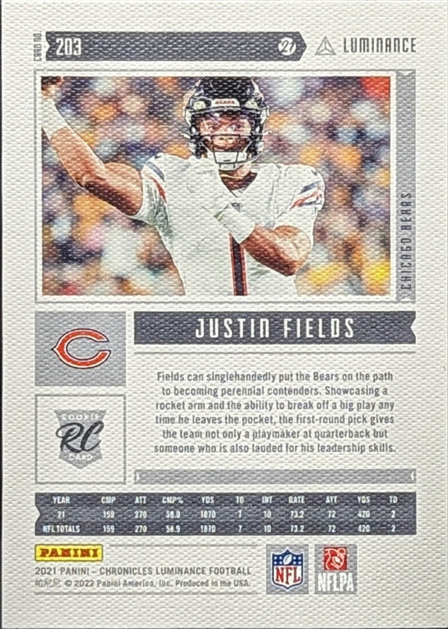 2021 Panini Chronicles Luminance Update Rookies Insert Pink Parallel #203 Justin Fields Chicago Bears RC