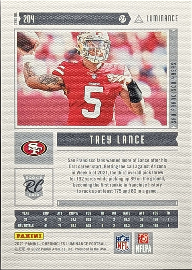 2021 Panini Chronicles Luminance Update Rookies Insert Pink Parallel #204 Trey Lance San Francisco 49ers RC
