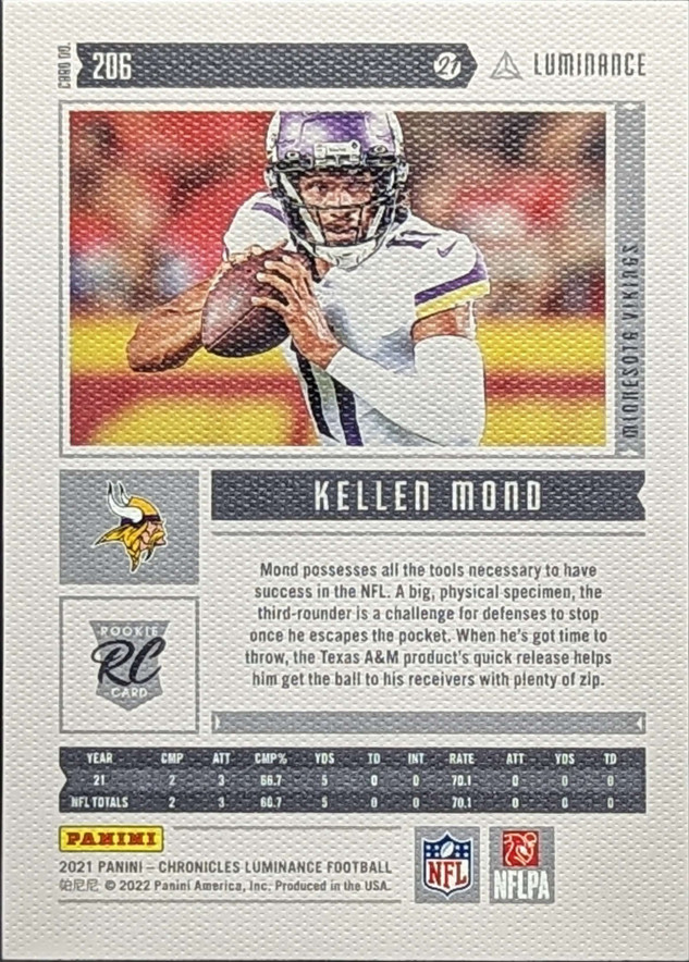2021 Panini Chronicles Luminance Update Rookies Insert Pink Parallel #206 Kellen Mond Minnesota Vikings RC
