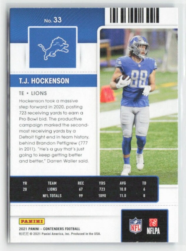 You are purchasing a 2021 Panini Contenders T.J. Hockenson #33. You will receive the exact item in the photographs. Thank you for looking.
