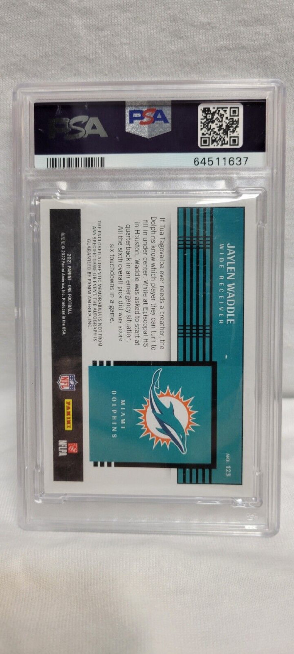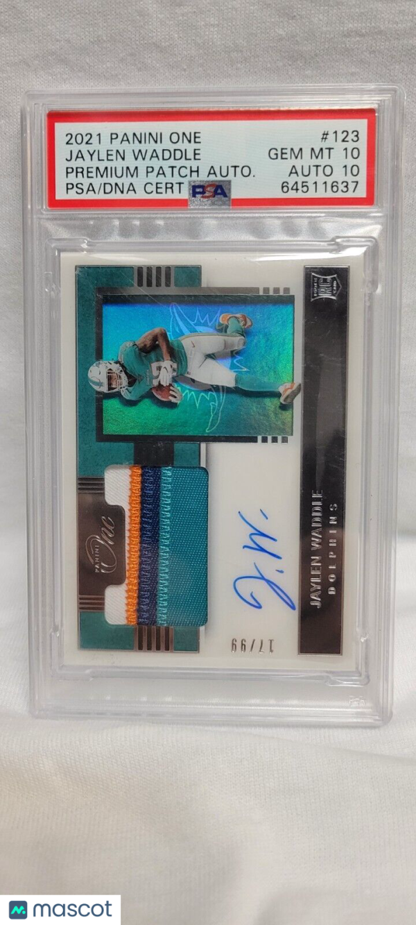 This 2021 Panini One Jaylen Waddle Premium Patch Auto RPA 17/99 PSA 10 Auto 10 *POP 1* jersey match is a must-have for any Miami Dolphins or National Football League (NFL) fan. The card features an autographed patch of Jaylen Waddle, a rookie player who has already made a name for himself in the NFL. The card is graded by Professional Sports Authenticator (PSA) and has received a perfect grade of 10.