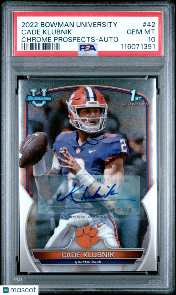 You are purchasing a 2022 Bowman University Chrome Prospects Cade Klubnik #42 Auto Rookie 1st Edition PSA 10 Panini Authentic. You will receive the exact item in the photographs.