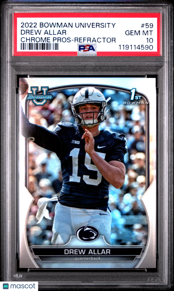 You are purchasing a 2022 Bowman University Chrome Prospects Drew Allar #59 Refractor Rookie Low Pop PSA 10. You will receive the exact item in the photographs.