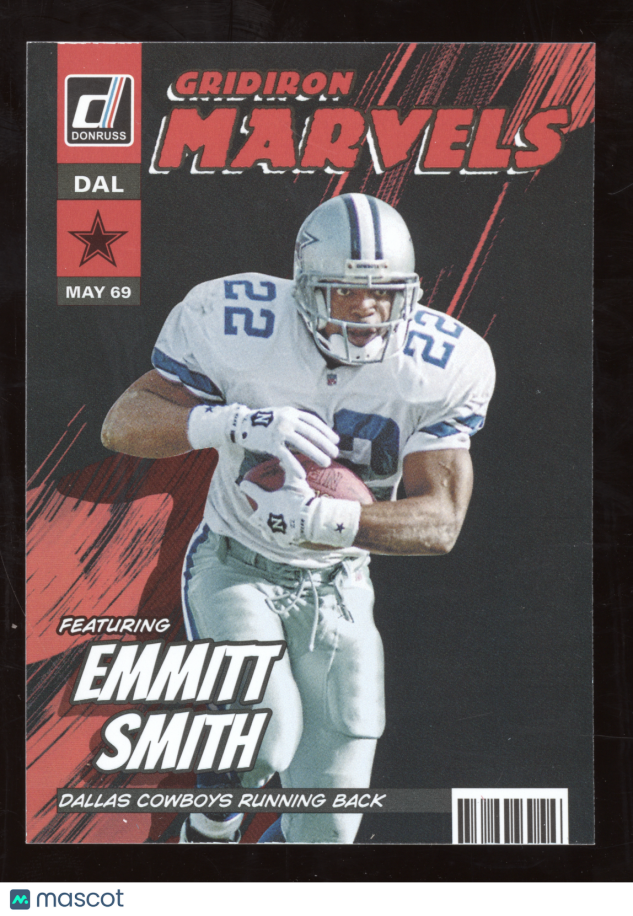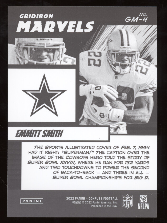 You are purchasing a 2022 Donruss Football Emmitt Smith #GM-4 Gridiron Marvels. You will receive the exact item in the photographs. Thank you for looking.