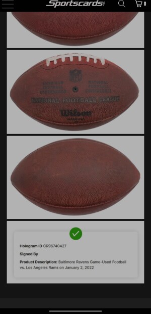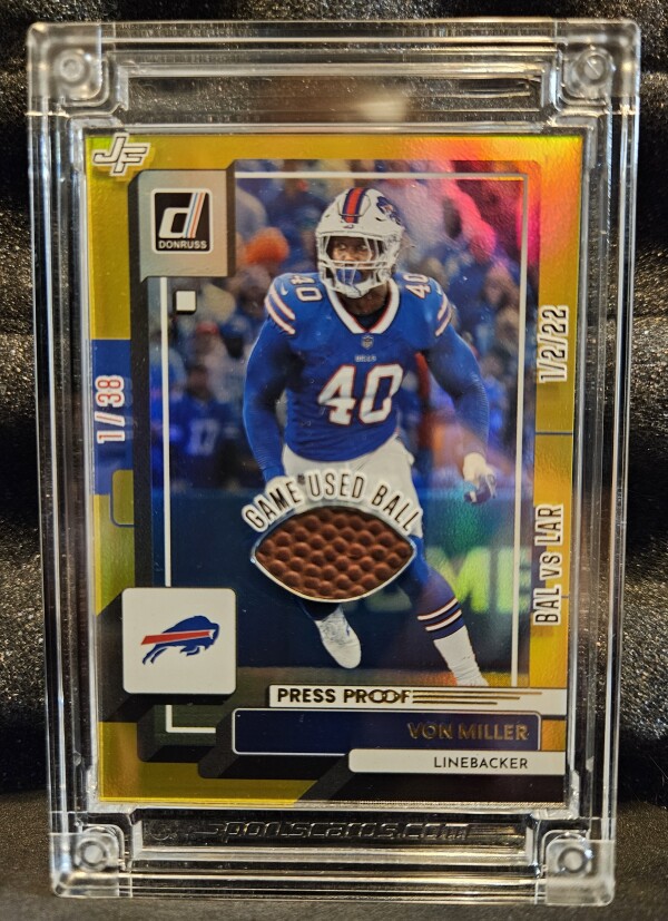 2022 Panini Donruss Optic 1/38 Von Miller Gold Prizm, Game-Used Ball" relic, which is a physical piece of a football used in an NFL game embedded into the card with QR code proof of game ball use.