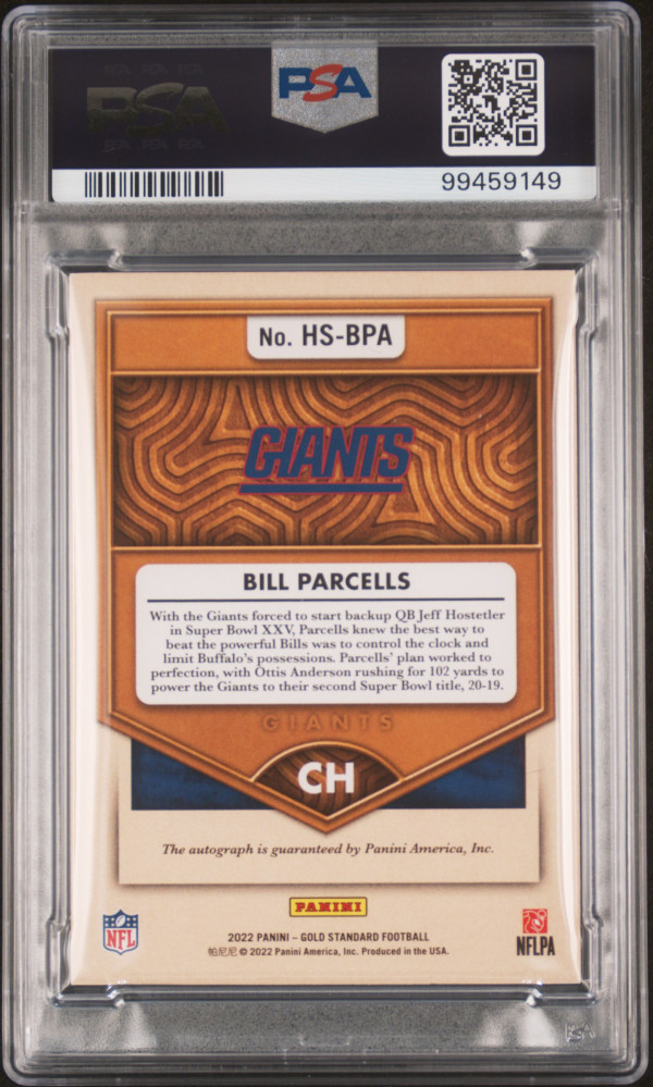You are purchasing a 2022 Panini Gold Standard Gold Fingers Autographs Bill Parcells #HSBPA Autograph Short Print 46/75 PSA 8. You will receive the exact item in the photographs.