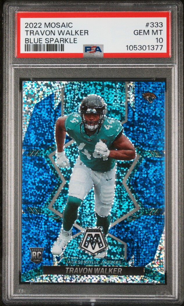 The 2022 Panini Mosaic Blue Sparkle Travon Walker ROOKIE #333 PSA 10 GEM MINT trading card is a highly sought-after collectible for football fans. This card features rookie player Travon Walker from the Jacksonville Jaguars in the National Football League. Manufactured by Panini, the card is part of the 2022 Mosaic set and has a sparkly blue parallel variety. As a PSA 10 GEM MINT card, it holds value for collectors looking for pristine sports trading cards.