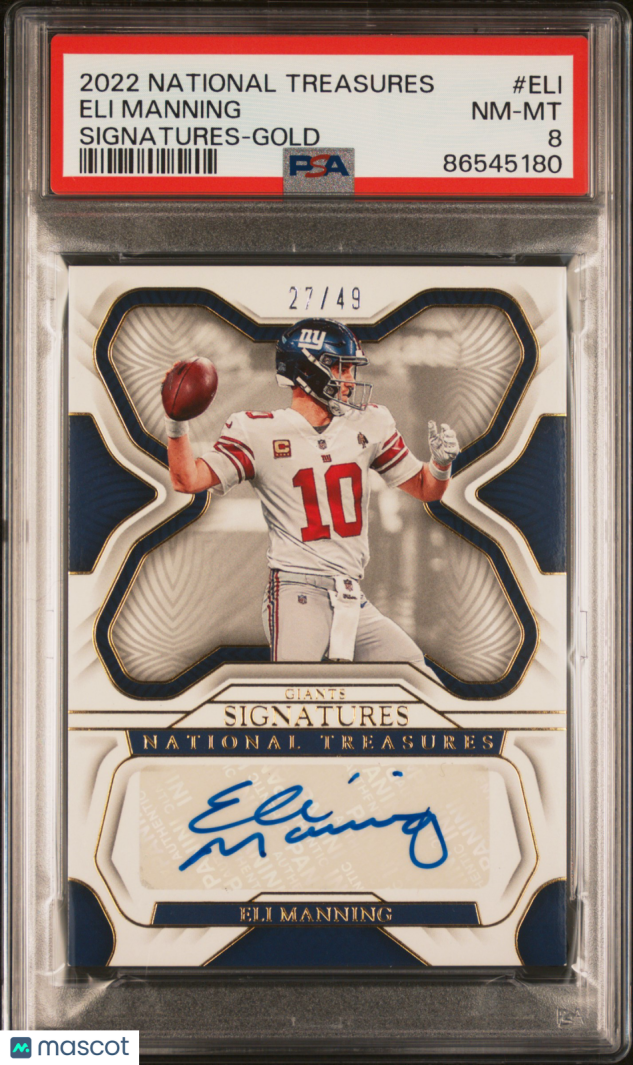 You are purchasing a 2022 Panini National Treasures Signatures Eli Manning #ELI Signatures Gold 27/49 PSA 8. You will receive the exact item in the photographs.