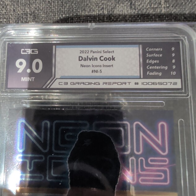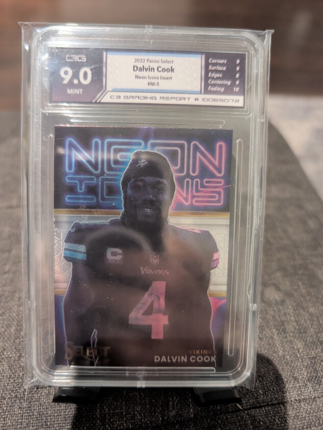 The 2022 Panini Select - Neon Icons Dalvin Cook #NI-5 Silver Prizm trading card is a standard-sized football card featuring the player Dalvin Cook from the Minnesota Vikings. This card is part of the 2022 Panini Select set and belongs to the Neon Icons insert set. Manufactured by Panini, the card is made of 35 Pt. card stock with a silver prizm parallel variety, making it a desirable collectible for fans and collectors of the