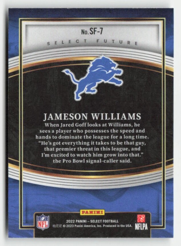 You are purchasing a 2022 Panini Select Jameson Williams #SF-7 Select Future. You will receive the exact item in the photographs. Thank you for looking.