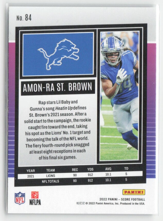 You are purchasing a 2022 Score Amon-Ra St. Brown #84. You will receive the exact item in the photographs. Thank you for looking.