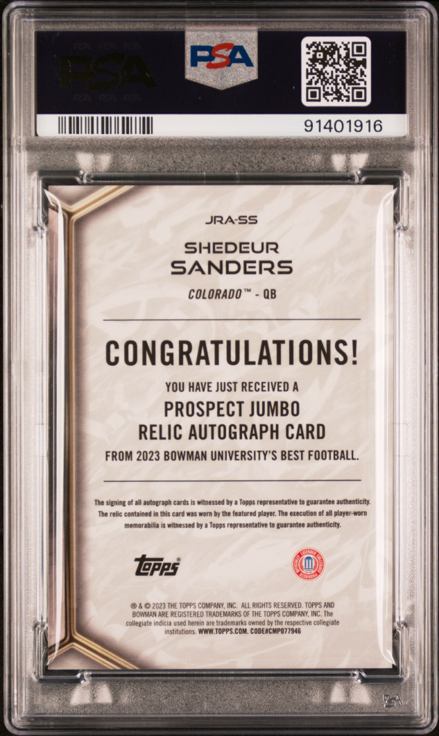 The product is a 2023 Bowman's Best University Prospect Jumbo Relic Autographs trading card featuring Shedeur Sanders of the Colorado Buffaloes football team. Produced by Topps, the card is a rookie insert with a certification number of 91401916 and a grade of 275020. This collectible item includes a piece of memorabilia from Sanders, making it a valuable addition to any sports trading card collection.