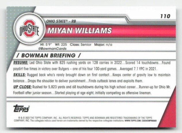 You are purchasing a 2023 Bowman University Chrome Miyan Williams #110. You will receive the exact item in the photographs. Thank you for looking.