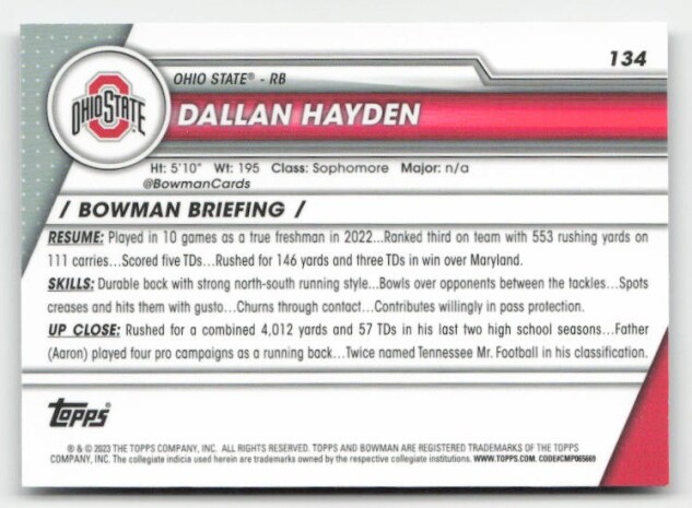 You are purchasing a 2023 Bowman University Chrome Dallan Hayden #134. You will receive the exact item in the photographs. Thank you for looking.
