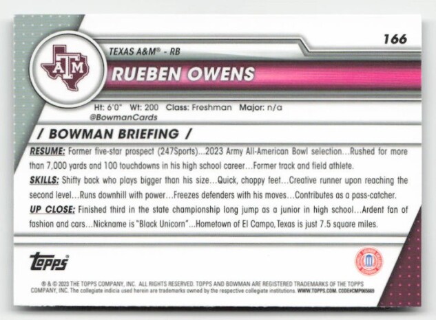 You are purchasing a 2023 Bowman University Chrome Rueben Owens #166 X-Fractor. You will receive the exact item in the photographs. Thank you for looking.