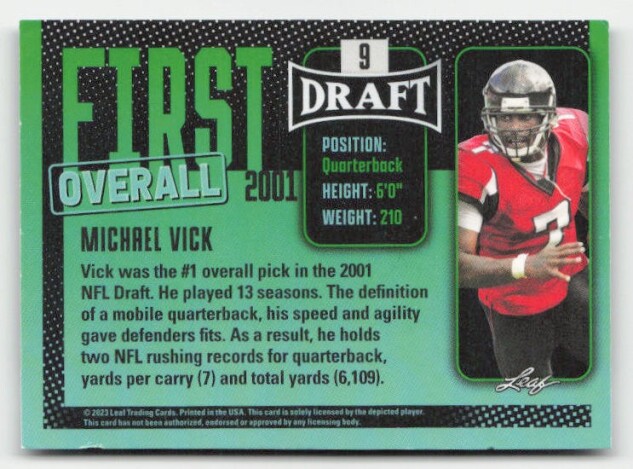 You are purchasing a 2023 Leaf Draft Michael Vick #9. You will receive the exact item in the photographs. Thank you for looking.