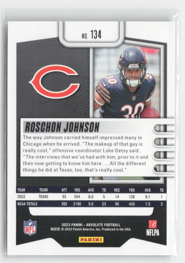 You are purchasing a 2023 Panini Absolute Roschon Johnson #134 Retail RC. You will receive the exact item in the photographs. Thank you for looking.