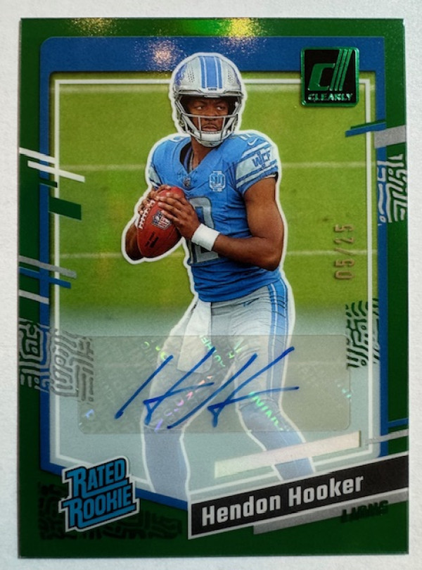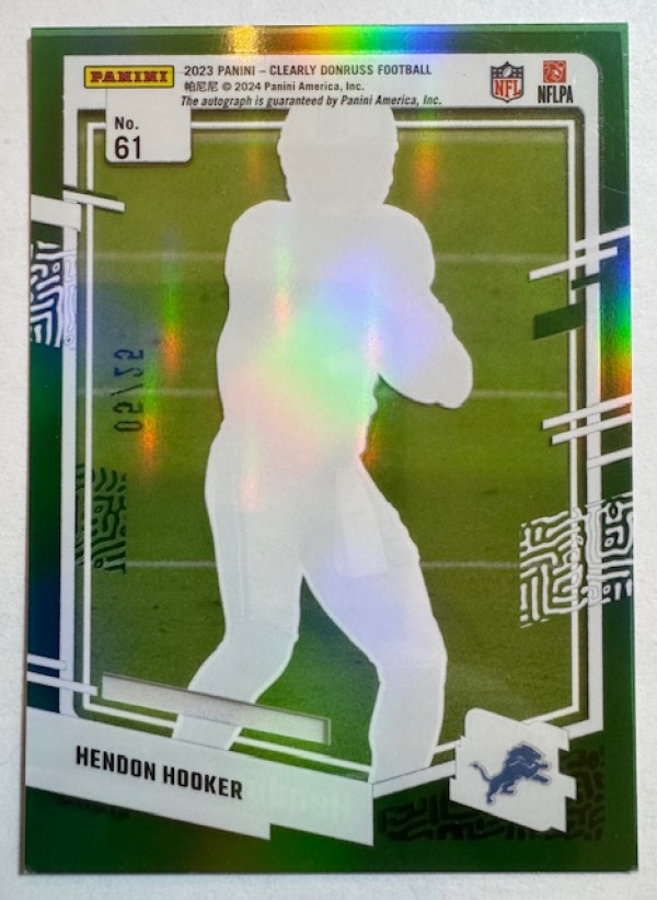 The 2023 Panini Clearly Donruss Hendon Hooker Rated Rookie Auto Green RC /25 is a highly sought-after football trading card featuring an autograph from the rookie player Hendon Hooker. This limited edition card is part of the 2023 Panini Clearly Donruss set and is autographed with a label or sticker. With a print run of only 25, this card is a valuable addition to any sports trading card collection, especially for fans of the Detroit Lions and the NFL. Made of high-quality card stock and manufactured by Panini in the United States, this card is a must-have for football card enthusiasts.