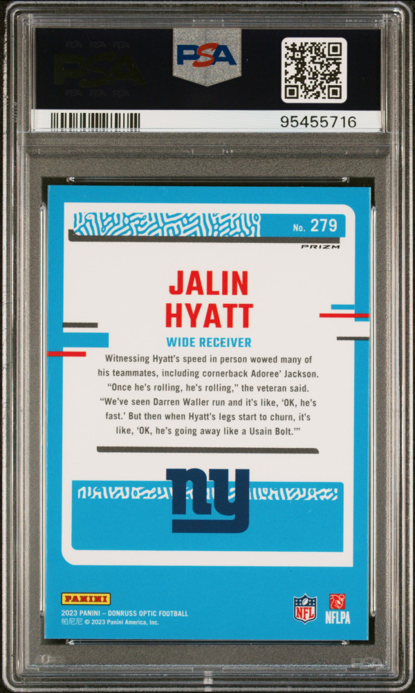 You are purchasing a 2023 Panini Donruss Optic Jalin Hyatt #279 Green Velocity Short Print Rookie PSA 9. You will receive the exact item in the photographs.