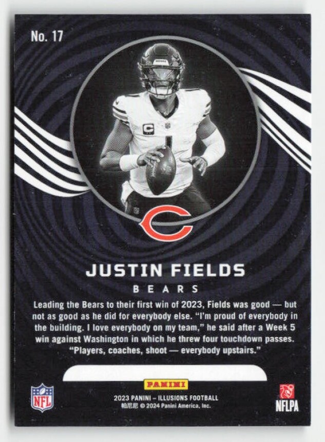 You are purchasing a 2023 Panini Illusions Justin Fields #17 Retail. You will receive the exact item in the photographs. Thank you for looking.