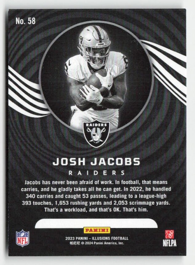 You are purchasing a 2023 Panini Illusions Josh Jacobs #58 Retail. You will receive the exact item in the photographs. Thank you for looking.