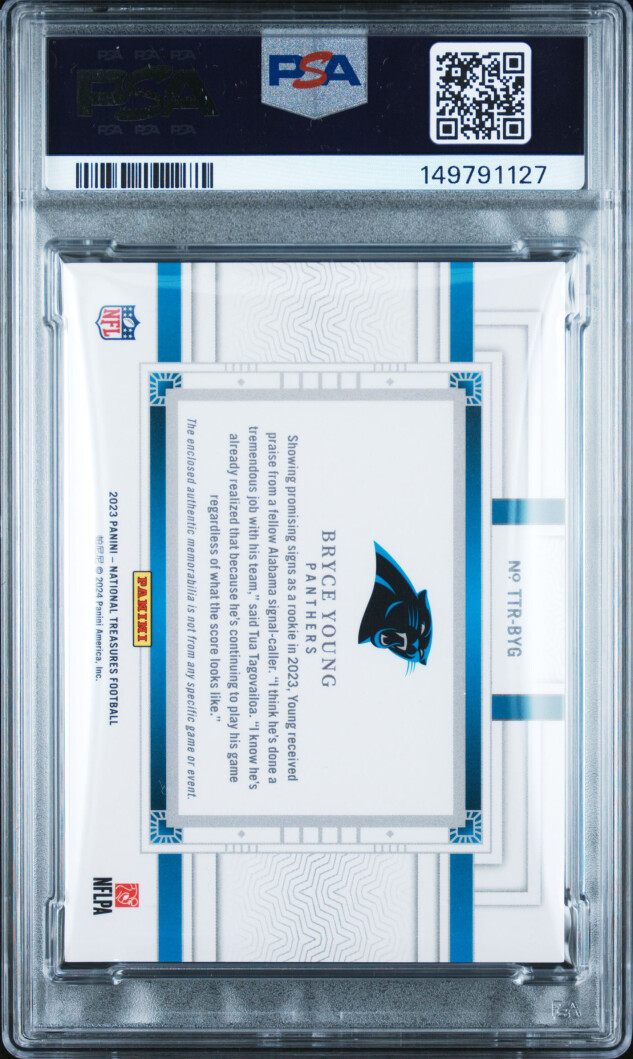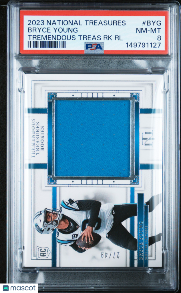 You are purchasing a 2023 Panini National Treasures Tremendous Treasures Rookies Relics Bryce Young #BYG 27/49 PSA 8. You will receive the exact item in the photographs. Thank you for looking.