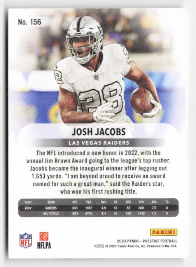 You are purchasing a 2023 Panini Prestige Josh Jacobs #156. You will receive the exact item in the photographs. Thank you for looking.