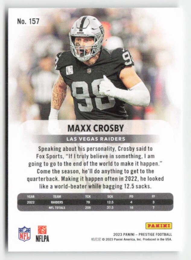 You are purchasing a 2023 Panini Prestige Maxx Crosby #157. You will receive the exact item in the photographs. Thank you for looking.