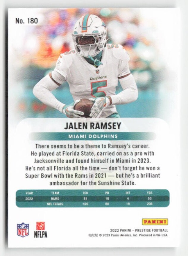 You are purchasing a 2023 Panini Prestige Jalen Ramsey #180. You will receive the exact item in the photographs. Thank you for looking.