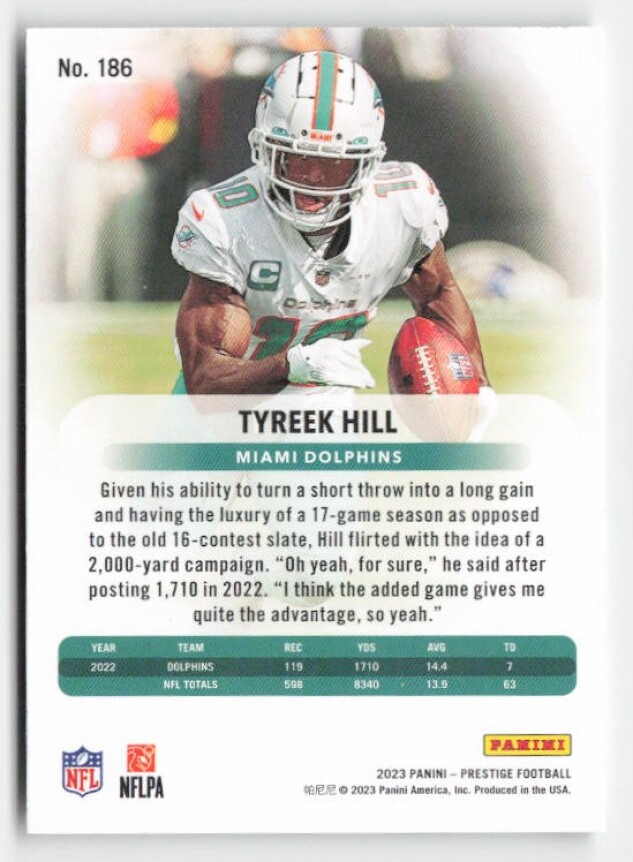 You are purchasing a 2023 Panini Prestige Tyreek Hill #186. You will receive the exact item in the photographs. Thank you for looking.