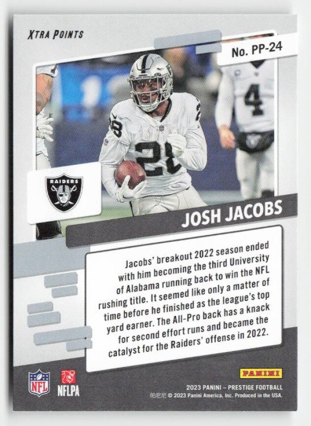 You are purchasing a 2023 Panini Prestige Josh Jacobs #PP-24 Prestigious Pros. You will receive the exact item in the photographs. Thank you for looking.