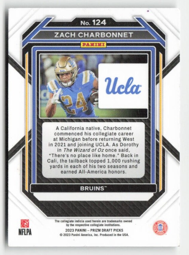 You are purchasing a 2023 Panini Prizm Draft Picks Zach Charbonnet #124. You will receive the exact item in the photographs. Thank you for looking.