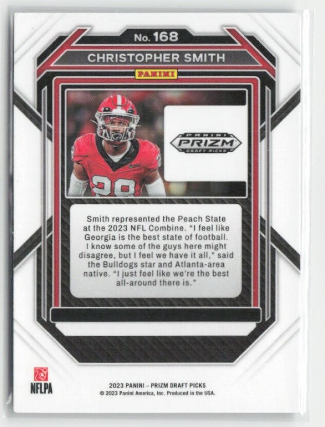 You are purchasing a 2023 Panini Prizm Draft Picks Christopher Smith #168 Prizms Silver. You will receive the exact item in the photographs. Thank you for looking.