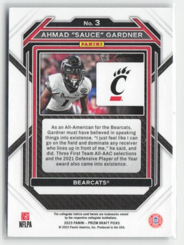 You are purchasing a 2023 Panini Prizm Draft Picks Ahmad "Sauce" Gardner #3. You will receive the exact item in the photographs. Thank you for looking.