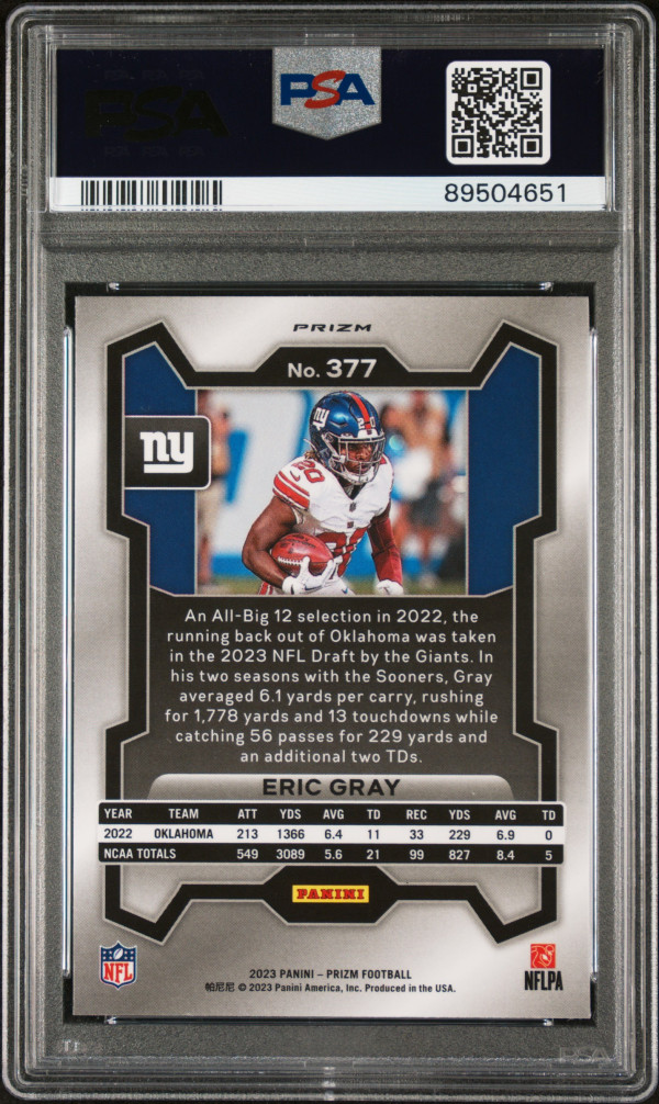 You are purchasing a 2023 Panini Prizm Eric Gray #377 Silver Short Print Rookie PSA 9. You will receive the exact item in the photographs.