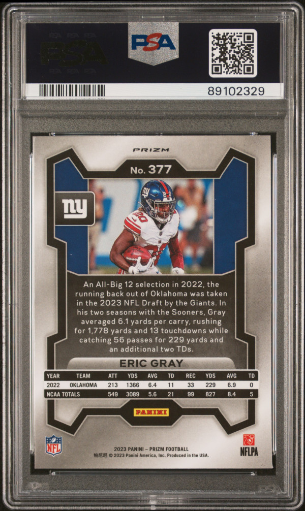 You are purchasing a 2023 Panini Prizm Eric Gray #377 Lazer Short Print Rookie PSA 10. You will receive the exact item in the photographs.