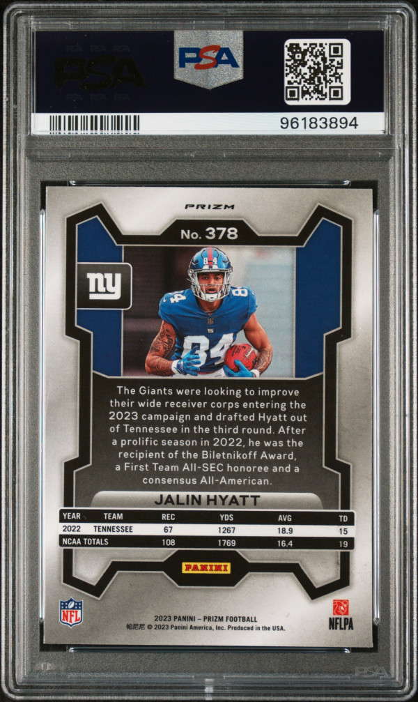 You are purchasing a 2023 Panini Prizm Jalin Hyatt #378 Silver Prizm Short Print Rookie PSA 9. You will receive the exact item in the photographs.