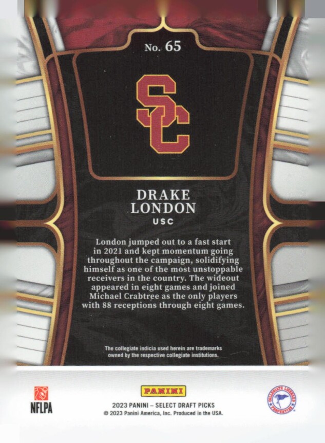 You are purchasing a 2023 Panini Select Draft Picks Drake London #65 Blue Retail. You will receive the exact item in the photographs. Thank you for looking.