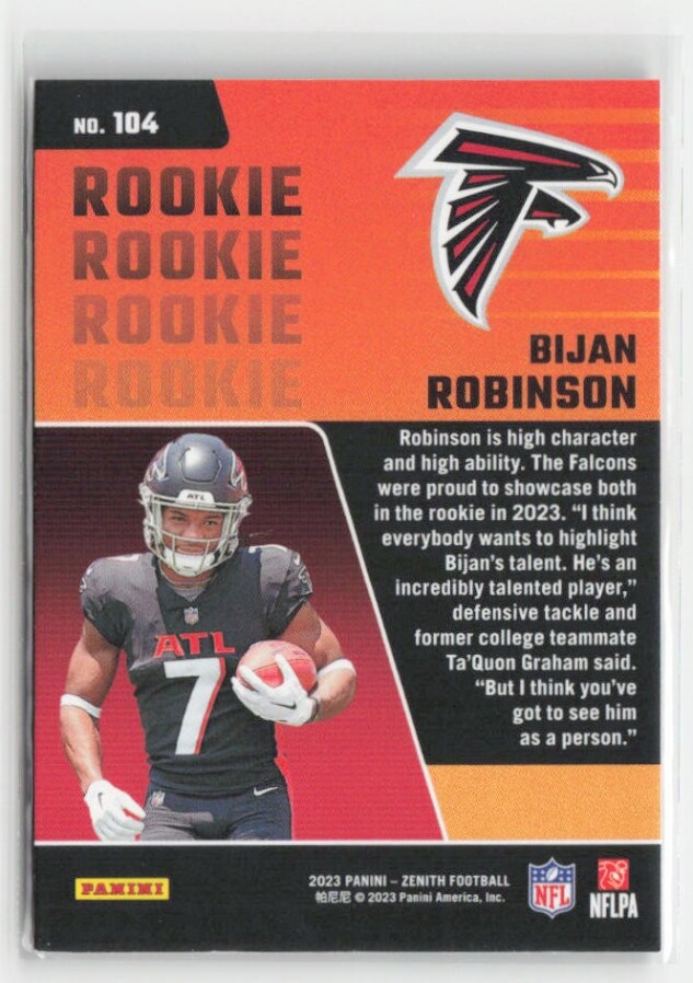 You are purchasing a 2023 Panini Zenith Bijan Robinson #104 Red Zone RC. You will receive the exact item in the photographs. Thank you for looking.