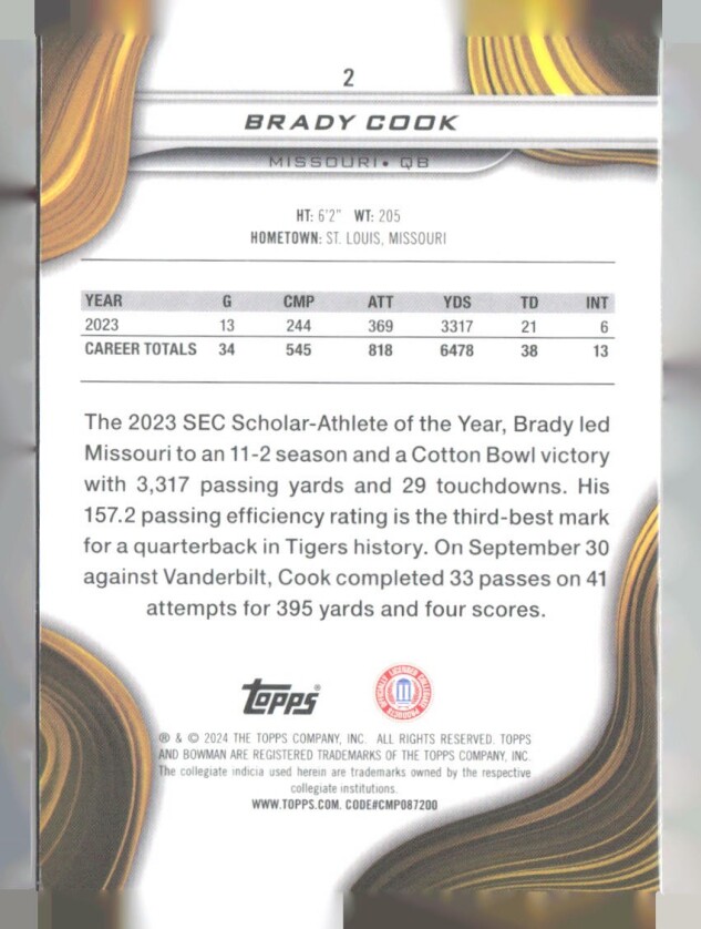 You are purchasing a 2024 Bowman University Best Brady Cook #2. You will receive the exact item in the photographs. Thank you for looking.