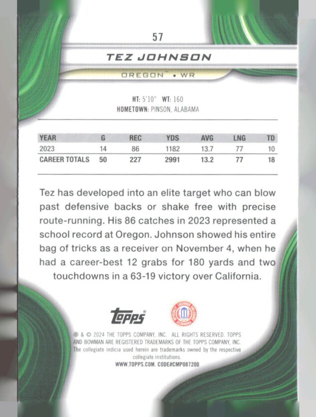 You are purchasing a 2024 Bowman University Best Tez Johnson #57. You will receive the exact item in the photographs. Thank you for looking.