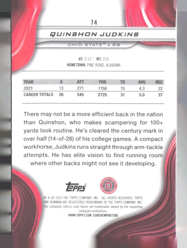 You are purchasing a 2024 Bowman University Best Quinshon Judkins #74. You will receive the exact item in the photographs. Thank you for looking.