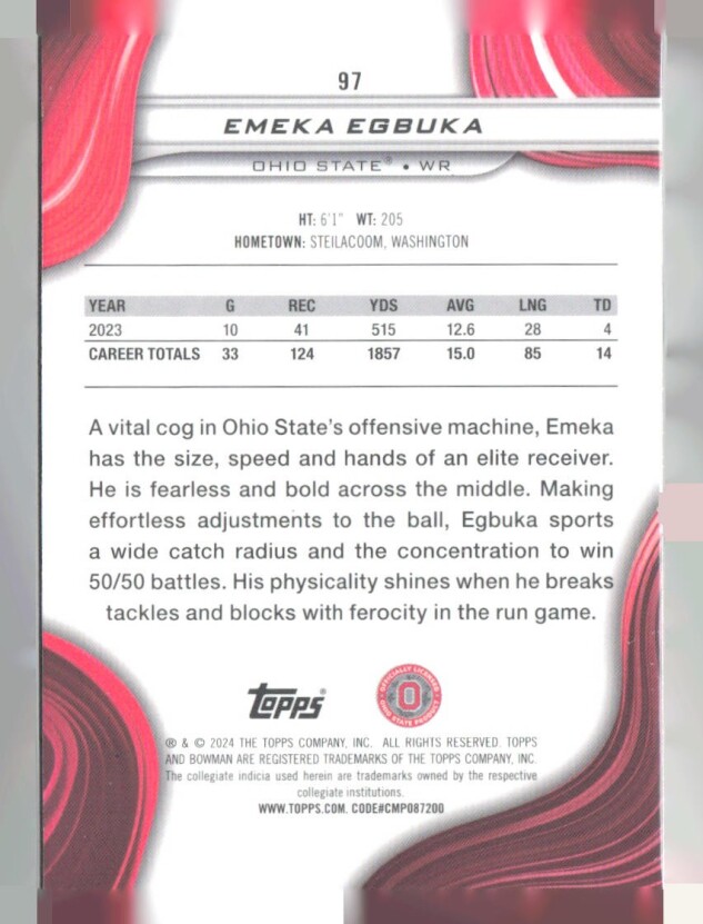 You are purchasing a 2024 Bowman University Best Emeka Egbuka #97. You will receive the exact item in the photographs. Thank you for looking.