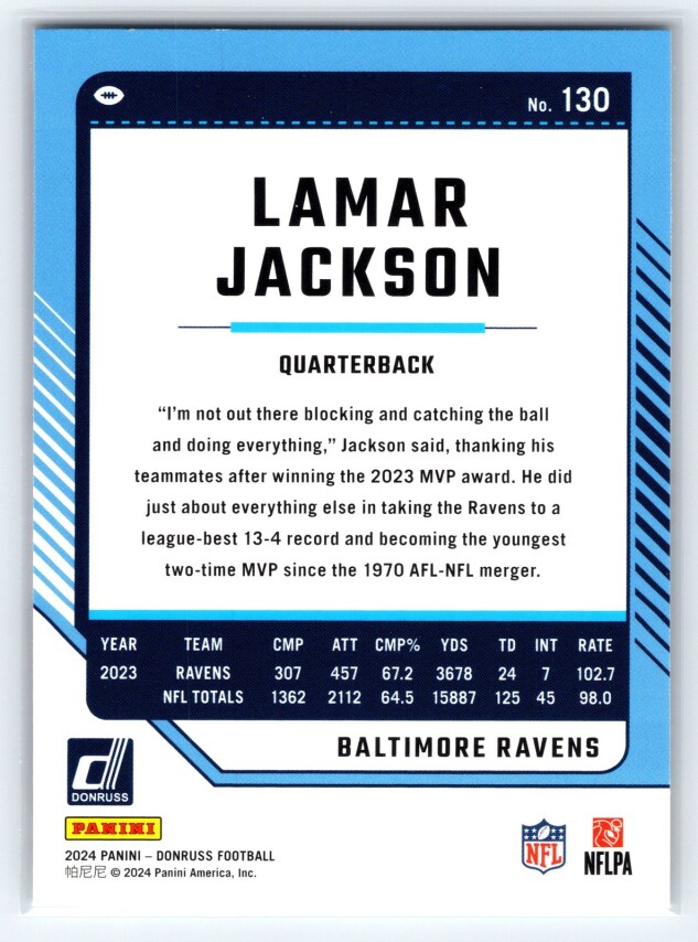 You are purchasing a 2024 Donruss Lamar Jackson #130. You will receive the exact item in the photographs. Thank you for looking.