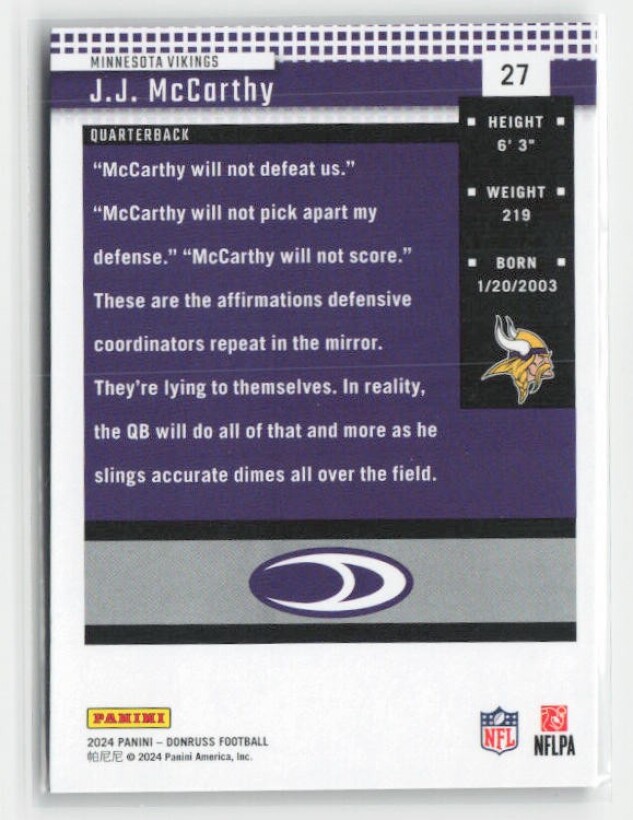 You are purchasing a 2024 Donruss J.J. McCarthy #27 Retro 2004. You will receive the exact item in the photographs. Thank you for looking.