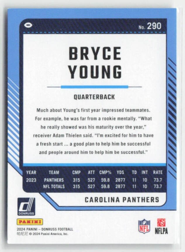 You are purchasing a 2024 Donruss Bryce Young #290 Press Proof Purple. You will receive the exact item in the photographs. Thank you for looking.