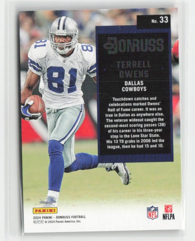 You are purchasing a 2024 Donruss Terrell Owens #33 Retro 1994. You will receive the exact item in the photographs. Thank you for looking.