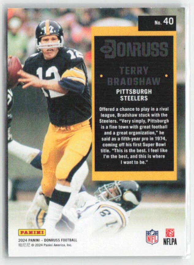 You are purchasing a 2024 Donruss Terry Bradshaw #40 Retro 1994. You will receive the exact item in the photographs. Thank you for looking.