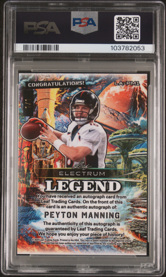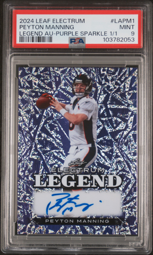 The product is a 2024 Leaf Electrum Legend Autographs trading card featuring a purple sparkle design and autographed by Peyton Manning. This one-of-a-kind card is certified by Leaf and professionally graded, making it a highly sought-after collectible for football fans and collectors. With its unique design and rare autograph, this card is a valuable addition to any sports trading card collection.